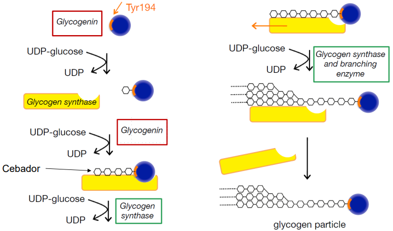 Cuando el cebador se ha ensamblado, Glucógeno sintasa y Enzima ramificante se encargarán de la elongación y biosíntesis de Glucógeno.