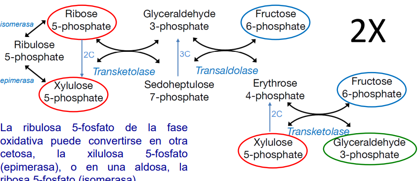 Conversión de ribosa 5-fosfato en fructosa 6-fosfato → requiere dos enzimas; la transcetolasa y la transaldolasa. Fase reversible.