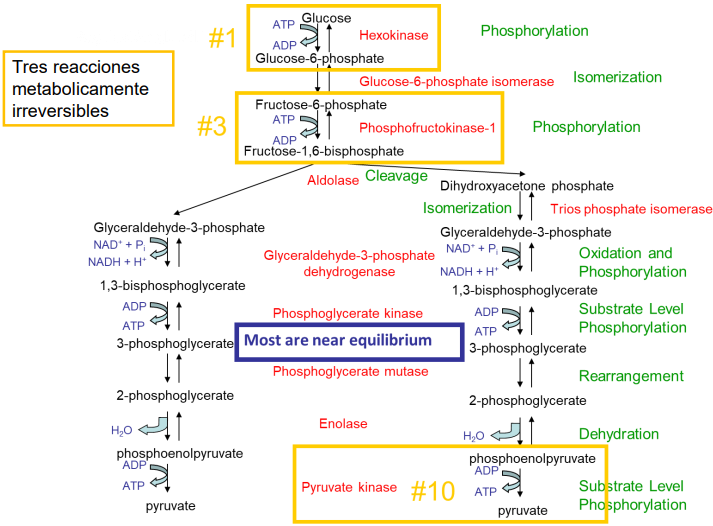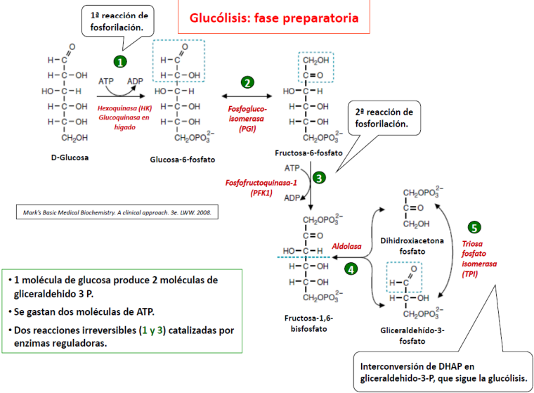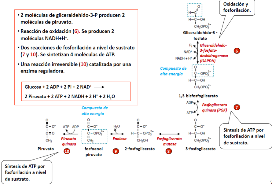 El conjunto de las dos reacciones 6 y 7 constituye la primera fosforilación a nivel de sustrato en la glucólisis generando 3-PG.