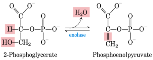 La posición 2 del grupo fosfato en el 2-PG es crítica para la siguiente reacción, que consiste en la reacción de hidrólisis del 2-PG y la pérdida de una molécula de agua a partir de los átomos asociados a los C 2 y 3.