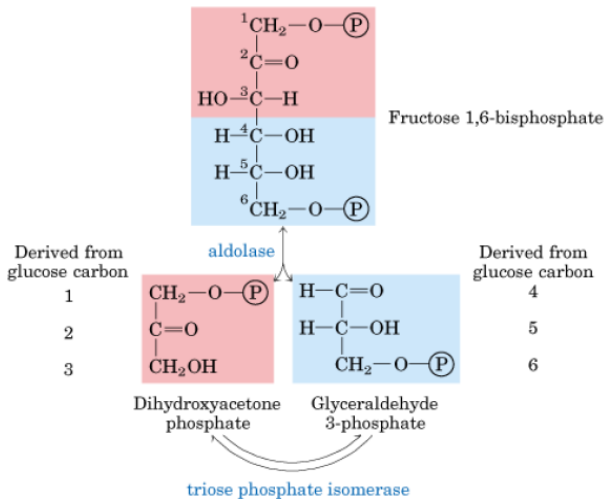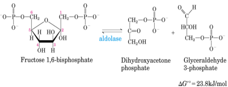 La Fructosa-1,6-bisfosfato se rompe en 2 triosas fosfato (Dihidroxiacetona fosfato y gliceraldehido-3-fosfato ) por un proceso de condensación aldólica reversible.