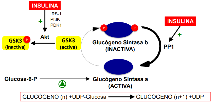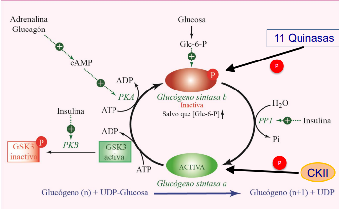 Glucógeno Sintasa Kinasa 3 (GSK3) es la principal kinasa que se encarga de fosforilar la glucógeno sintasa. Cuando actúa la insulina, esta es inactivada por fosforilación gracias a las PKB, activada por la glucosa.