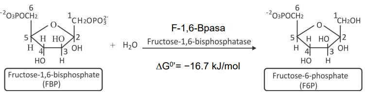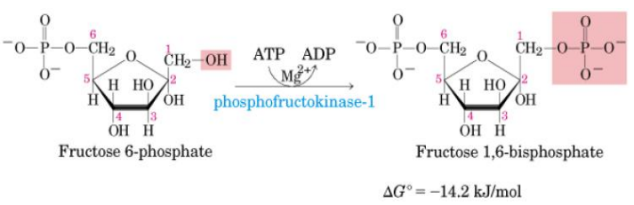 La Fructosa-6-fosfato recibe un grupo fosfato en posición 1 generando Fructosa-1,6-bifosfato.
