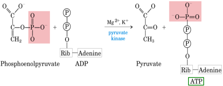 La transferencia del grupo fosfato desde el PEP hasta el ADP es la segunda fosforilación a nivel de sustrato y la última reacción de la glucólisis.