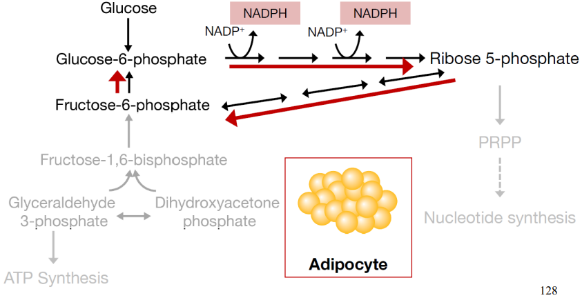 Adipocitos: Necesitan ↑ NADPH para la síntesis de AGs → Reciclaje de la G-6-P → prevalece la síntesis de NADPH sobre la síntesis de ATP a través de la glucólisis.