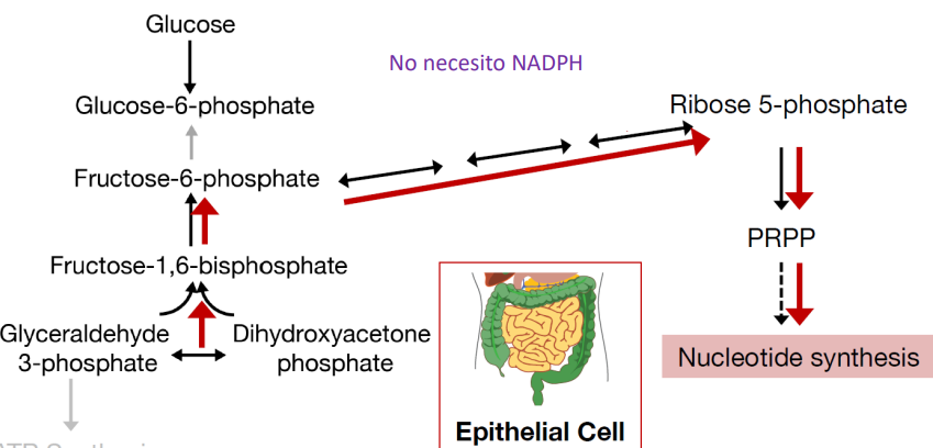 Células del epitelio intestinal: Células muy proliferativas → Necesitan una gran reserva de nucleótidos para fabricar ADN y ARN → fase oxidativa hacia adelante y fase no oxidativa a la inversa.