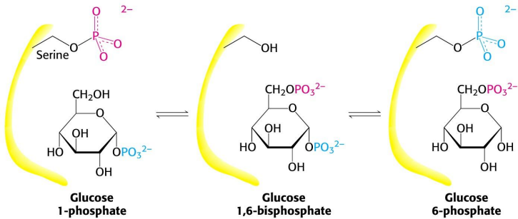 Cataliza el desplazamiento del grupo fosfato G1P → G6P. Interviene un residuo fosforilado de serina de su centro activo.