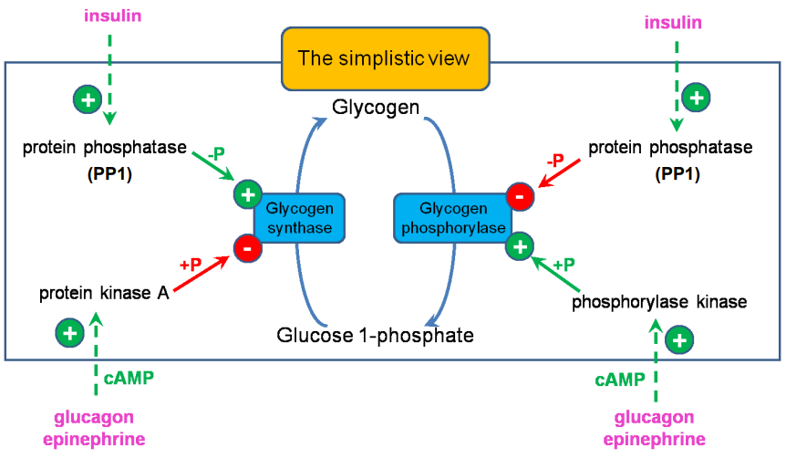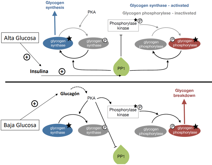 Las enzimas claves de esta regulación son la Glucógeno fosforilasa y la Glucógenos sintasa.
