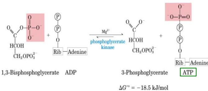 El potencial de transferencia del 1,3-BPG es superior al ATP, por lo que se puede transferir un grupo fosfato desde el 1,3-BPG hasta el ADP.
