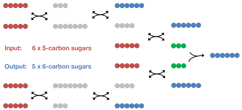 Transferencia de unidades de 2C y 3C entre diferentes monosacáridos para reconstruir moléculas de 6C.