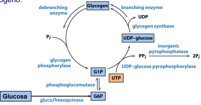La Biosíntesis de glucógeno se produce en el hígado y el músculo cuando la concentración de glucosa en sangre es elevada y haya energía suficiente para la activación de glucosa (UTP).