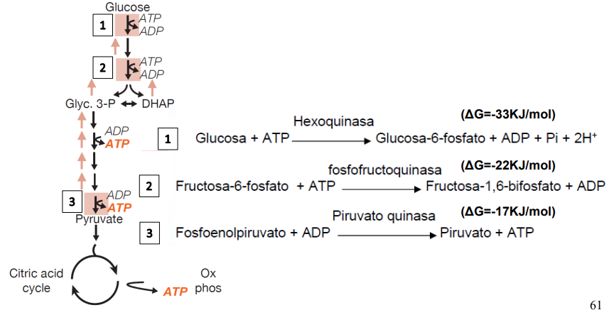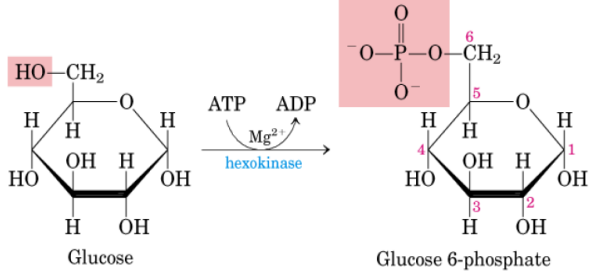 Catalizada por la hexoquinasas (hay diferentes isoenzimas). Requiere Mg2+ que neutraliza la carga negativa del ATP y facilita la transferencia del fosfato. Glucosa-6-fosfato ya no puede salir de la célula.