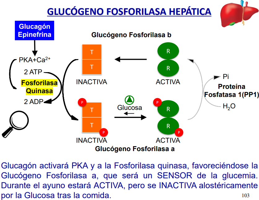 La epinefrina y el glucagón indican que falta glucosa y que hay que degradar el glucagón.