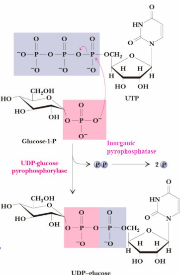 UDP-Glucosa Pirofosforilasa: activa la molécula de glucosa.