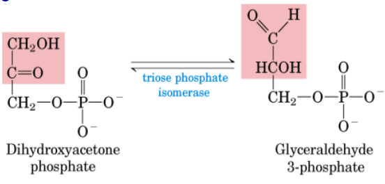 Los productos de la reacción anterior: dihidroxiacetona fosfato (DHAP) y gliceraldehido-3-fosfato (3-PGA) se interconvierten entre sí.