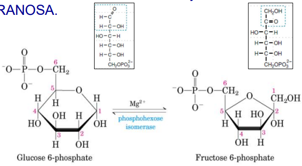 La Glucosa-6-fosfato se isomeriza a Fructosa-6-fosfato (piranosa → furanosa).