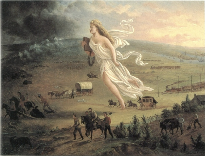 The portrayal of an angel, perhaps liberty herself, moving westward. Sanctioning the takeover of the remaining territories. In it’s way is Mexico. She brings light with her, the railroad, industrialization, farming.