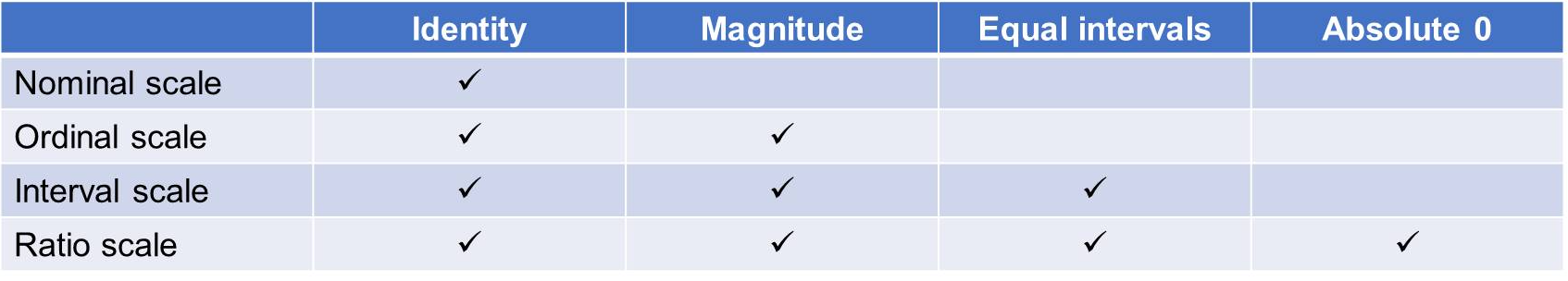 Ratio: Identity + Magnitude + Equal Intervals + Absolute Zero.