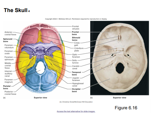Sphenoid bone - forms part of the cranium floor, lateral posterior portions of eye orbits, lateral portions of cranium anterior to temporal bones; Sella turcica