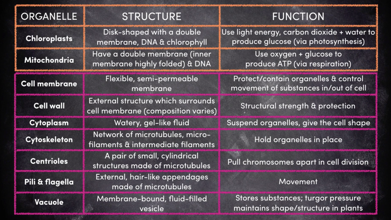 mitochontria: found in plant and animal cells, powerhouse of cell, double membrane, their own dna, perform chemical respiration: combine oxygen with glucose to create ATP, number of mitochondria in a cell depends on how much energy the cell needs