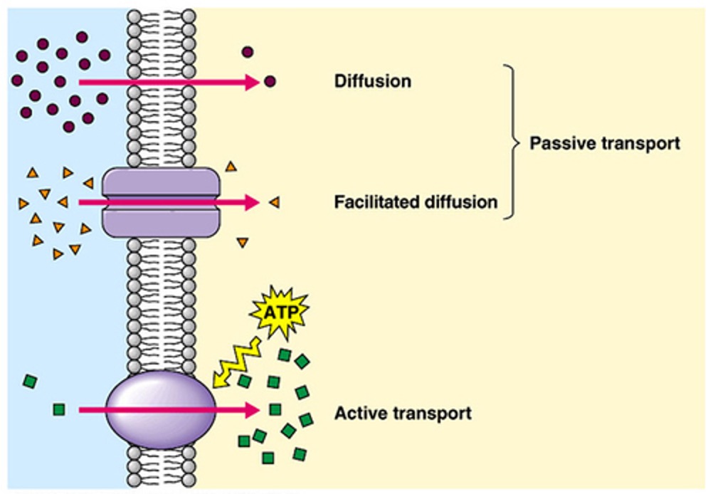 Passive transport requires no energy (includes diffusion, facilitated diffusion, and osmosis).