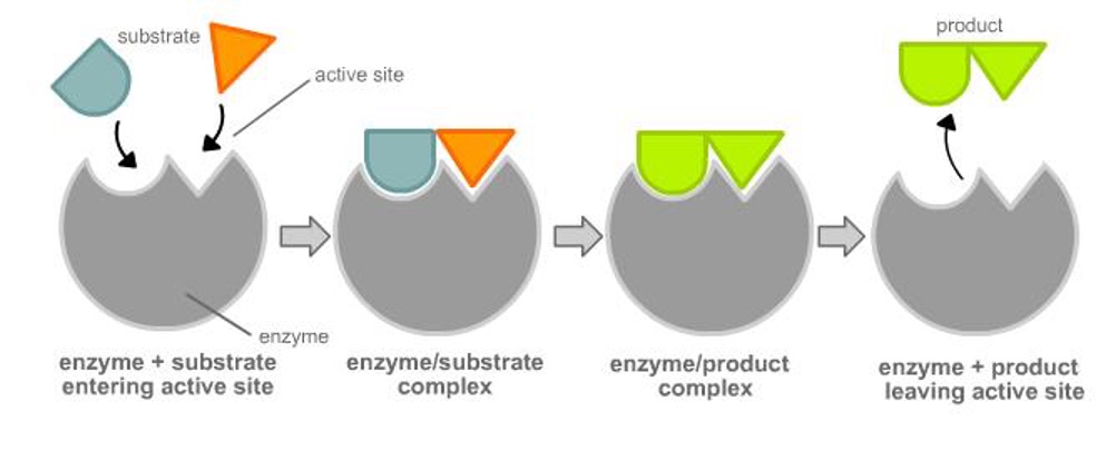 2.The enzyme first binds to a substrate (glucose, protein, starch etc) in an area called the active site (a pocket)