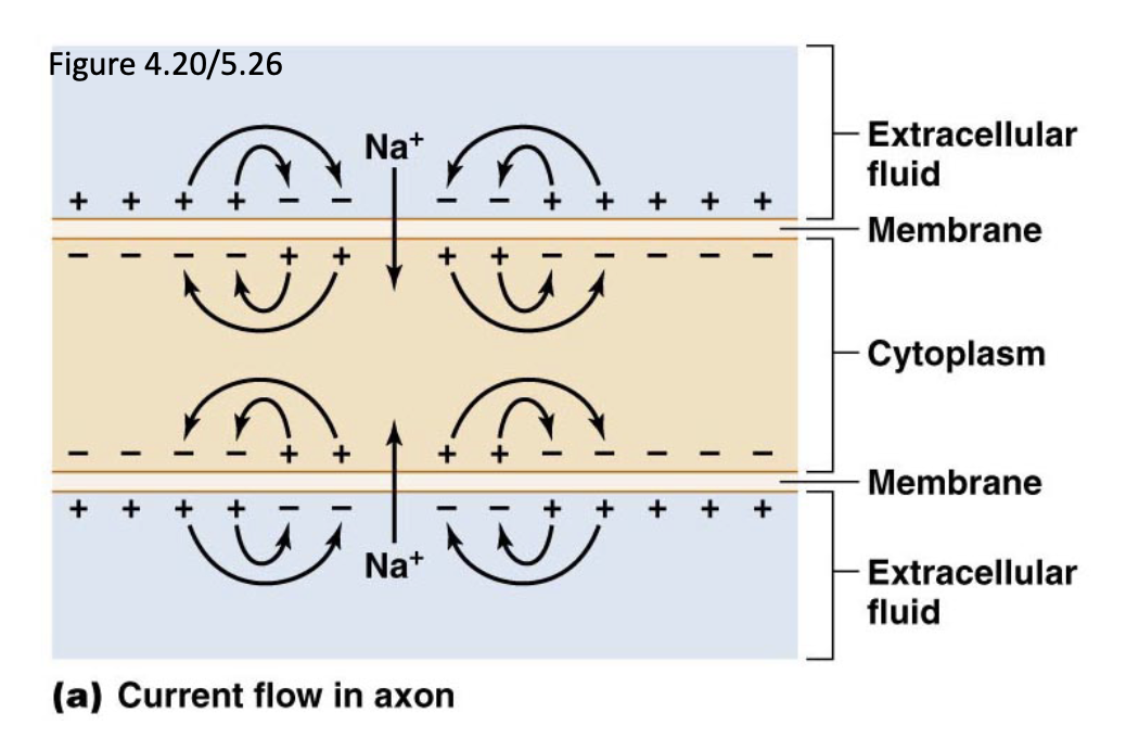 When Na+ flows into the neuron, positive current flows passively in both directions but APs are conducted in one direction