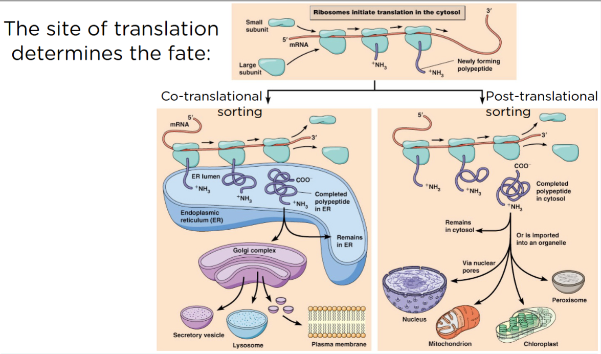 When did we determine to move the protein somewhere else? Was it after translation was finished (post translational sorting)? This is what happens to the proteins that were made on free cytosolic ribosomes. On the other side where you need to take a time out, that is called co-translational sorting.