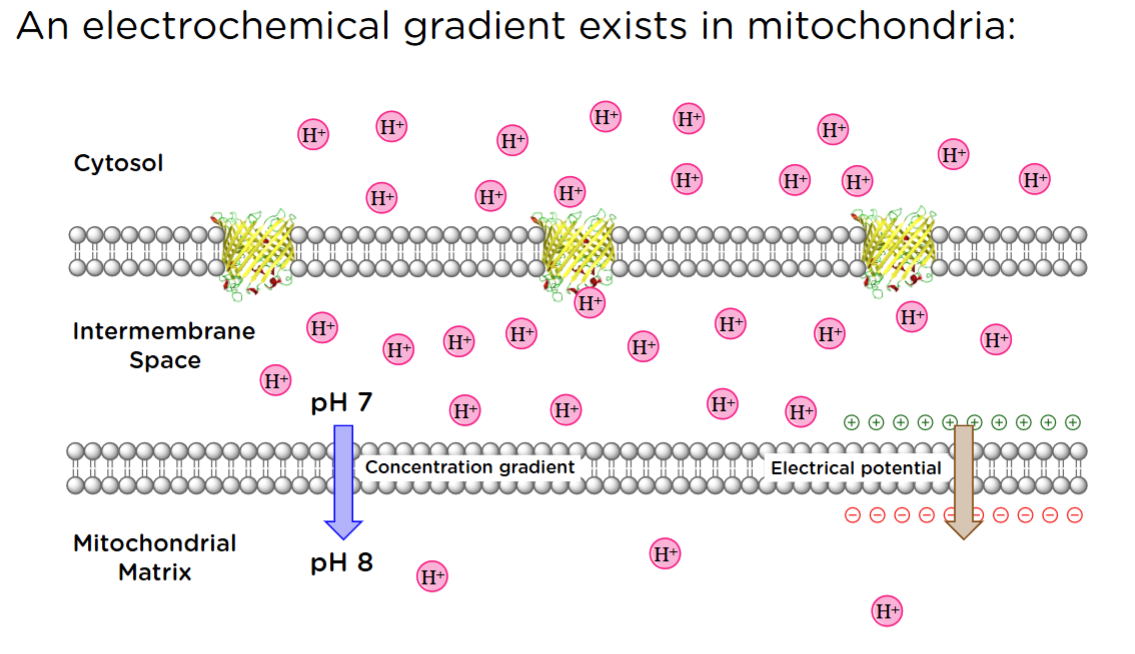 If you were positively charged and you approached the mitochondria, where would you rather be? In the matrix bc there are fewer other positive charges around you.