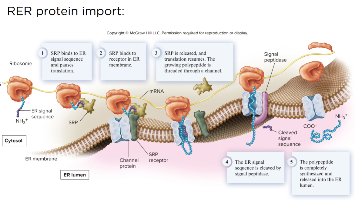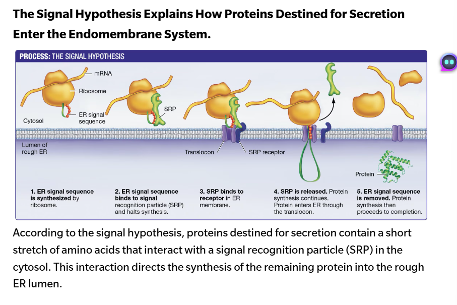 Something is presented that makes translation stop and goes to the ER. the first 25 amino acids that are destined for the co translational sorted side are called an ER signal peptide. It’s a set of amino acids that says don’t leave me where i am right now. This signal gets recognized by a particle by SRP (signal recognition particle, which has an RNA and a protein component). This SRP binds to the signal peptide and does 2 things. 1 pauses translation by blocking the a site 2 causes everybody to make their way to the ER.
