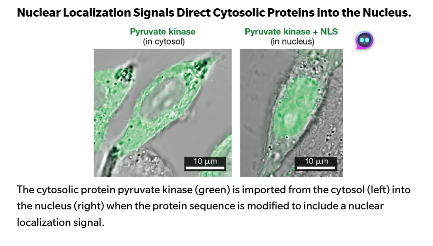 They present a signal that takes them to the nucleus. signal - sequence of amino acids that is compatible in its shape with some other molecule.