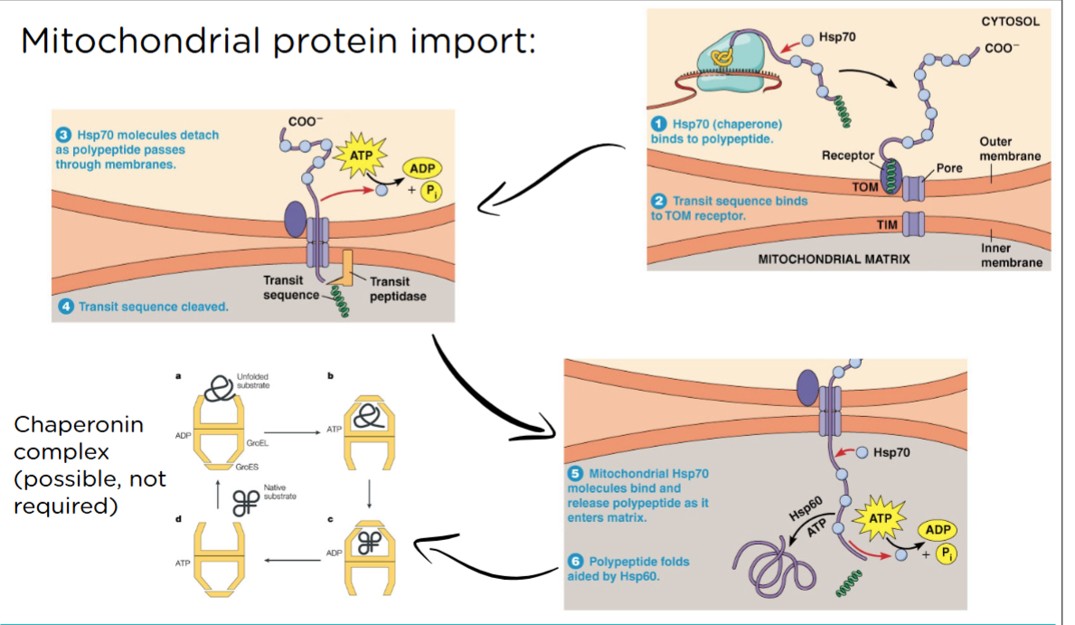 Certain channels can only open wide enough for an unfolded protein to get through. Every other transport channel that is embedded in a membrane and allows for the movement of a protein from one side to another is called a translocon. These can close all the way. they will only open wide enough for an unfolded protein to be roped through. There are chaperones that keep the proteins unfolded in the cytoplasm. The translocon of the outer membrane is called TOM. the translocon of the inner membrane is called TIM. You bind to a tom complex, it recognizes that transit sequence and 2 things start happening. 1 the head moves into the channel that just opened. 2 This opening also causes the nearest tim complex to open. If you just let go nothing would happen but bc the matrix is less positively charged and your head is in a more positively charged area, it gets pushed through. once it gets through 2 things happen. 1 peeling off those chaperones (ATP gets used) 2 don’t need the head anymore and transit sequence gets cut off. Matrix chaperones pull the rest in. They pull you in and help you fold properly. if those chaperones are not enough to get you folded the right way, we might have to put the protein in a protein folding canister, a chaperonin complex. ATP gets spent here. Once you are in the mitochondria you stay in there.