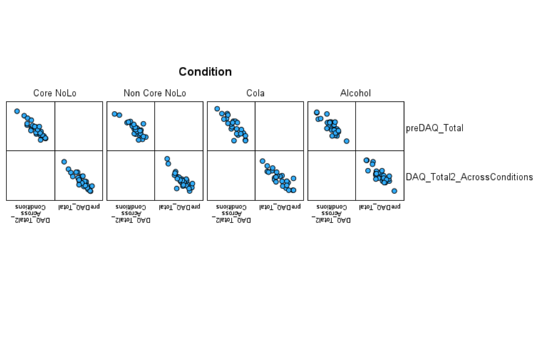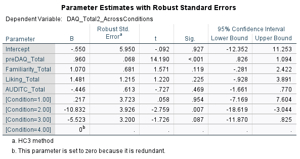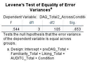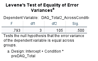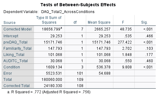 this uses the dependent variable postDAQ total, covariant: preDAQ, independent variable: conditions