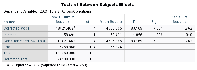 looking at the test of between-subjects Effects ‘condition*preDAQ_Total’ has a statistically significant results p < .05 (p < .001)