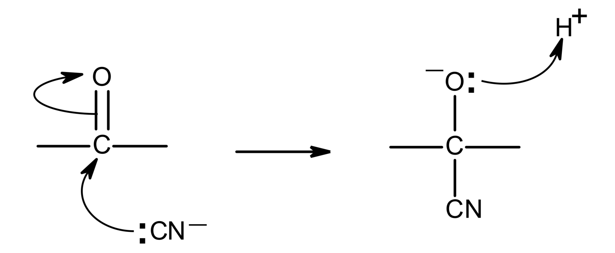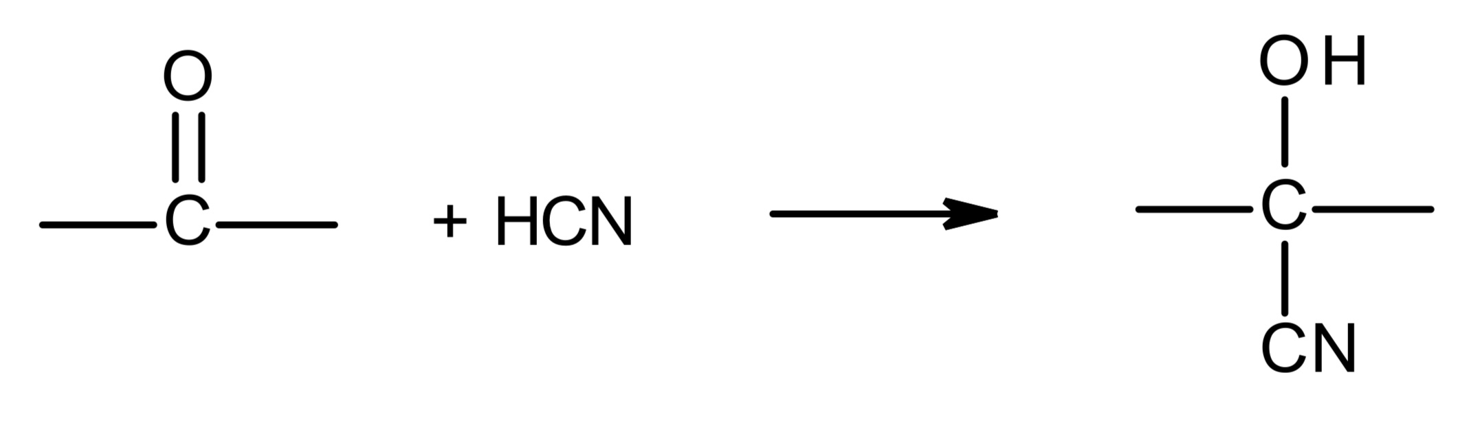 CN adds onto the C of the C=O, H adds onto the O of the C=O