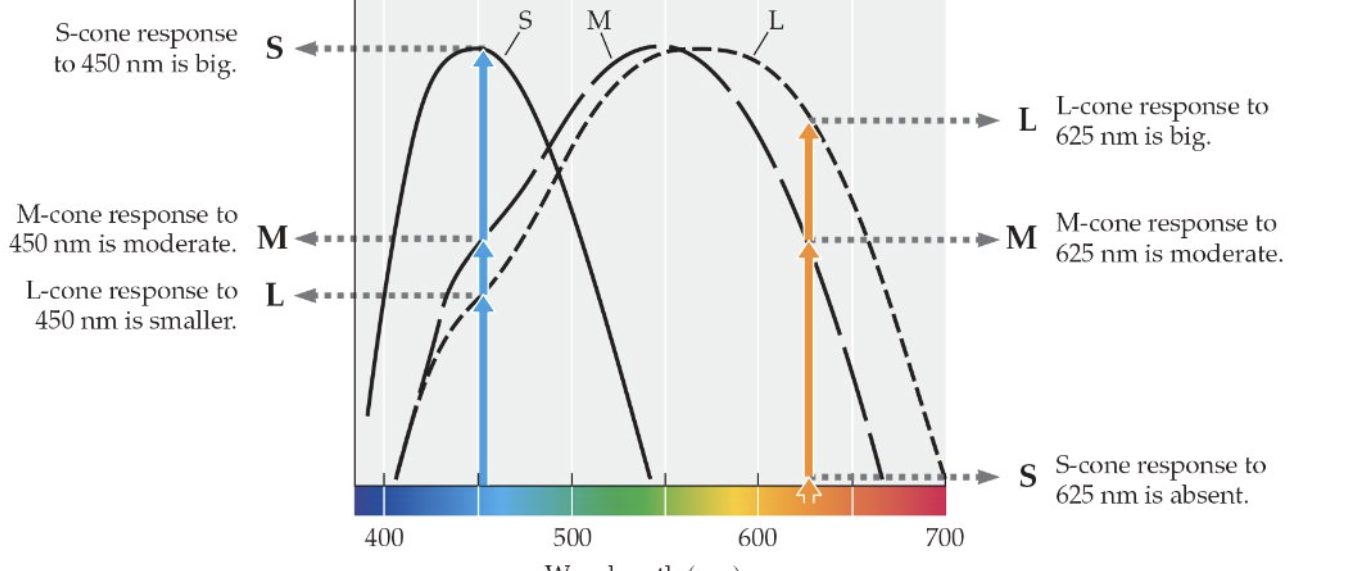 (Light at eye): Power spectrum → intensity of light at the eye as a function of wavelength at the eye - retinal input (physical)