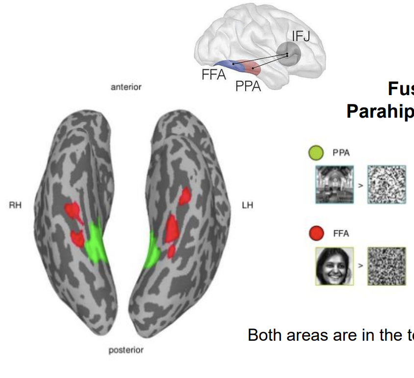 Fusiform Face Area (FFA) → is activated during face perception because it contains lots of individual neurons that are selective for configurations of stimuli corresponding to faces ( like RGCs are selective for edges)