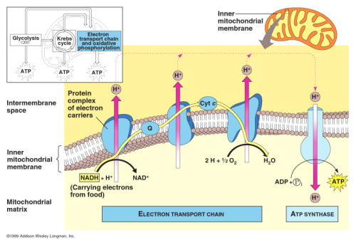Electrons go along the ETC losing energy to the proteins which allows Hydrogen ions in the Matrix to actively transport into the intermembrane space, in the intermembrane space there is a high concentration of H+ ions so they diffuse into the matrix by ATP synthase which creates ATP (Chemiosmosis)