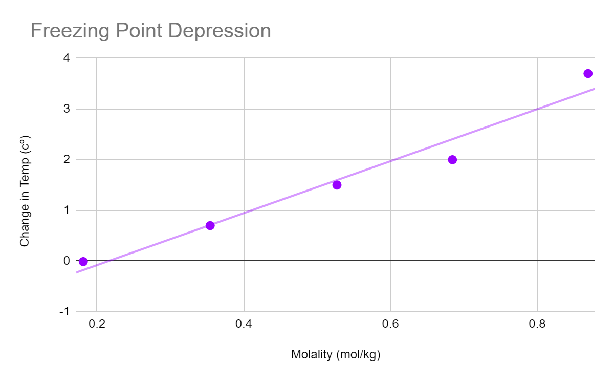 In this experiment a variety of tests were performed to find out if Sodium chloride (NaCl) was a good deicer for Minnesota roads. The test that were performed were finding the molarity (x axis) versus the change in freezing point (y axis)and finding the enthalpy of dissolution for NaCl. The graph has a slope that is equivalent to the van’t hoff factor. Enthalpy is calculated using a calorimeter. For this experiment, it was concluded that as molarity increases that change in temperature increased as well. The change in temperature from the data resulted in a freezing point decrease with is Optimal for a deicer. However, when it came to the Calorimeter results the temperature decreased, leading to believe that NaCl is not the best Deicer. To Conclude the experimnert, NaCl was not a good de-icer due to its endothermic nature in the calorimetry test. The van’t hoff factor for NaCl was ideal. Ultimately the three trials in the calorimetry test lead to the conclusion that NaCl was not a good deicer.