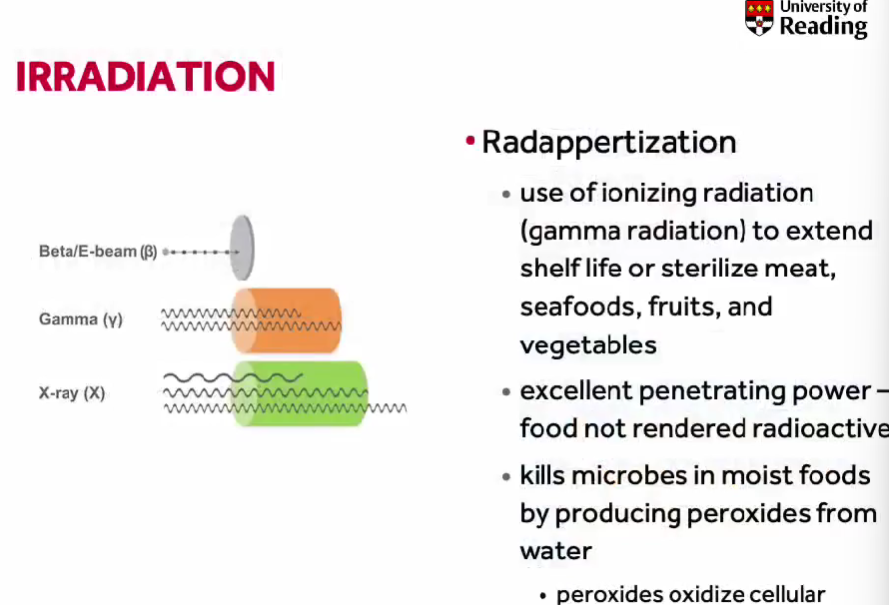 Irradiation (Radappertization): Use of gamma radiation to kill microbes and extend shelf life without rendering food radioactive.