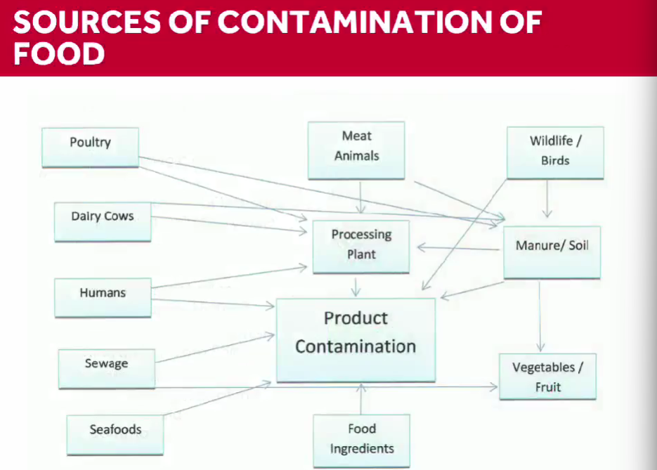 Various routes including animals, humans, wildlife, processing plants, sewage, etc. can contaminate food products. Key sources include: