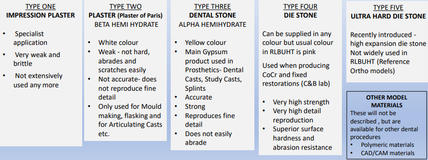 GYPSUM – (Calcium Sulphate) This material is provided in five versions, they are selected by the Laboratory for their intended use. (accuracy, hardness and expense.)
