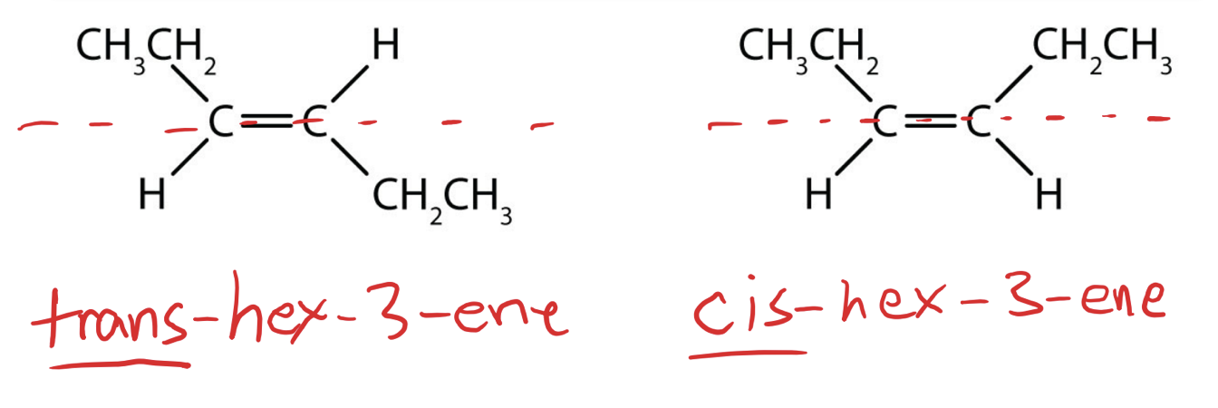 - Trans: the groups of interest are located on opposing planes of the double bond.