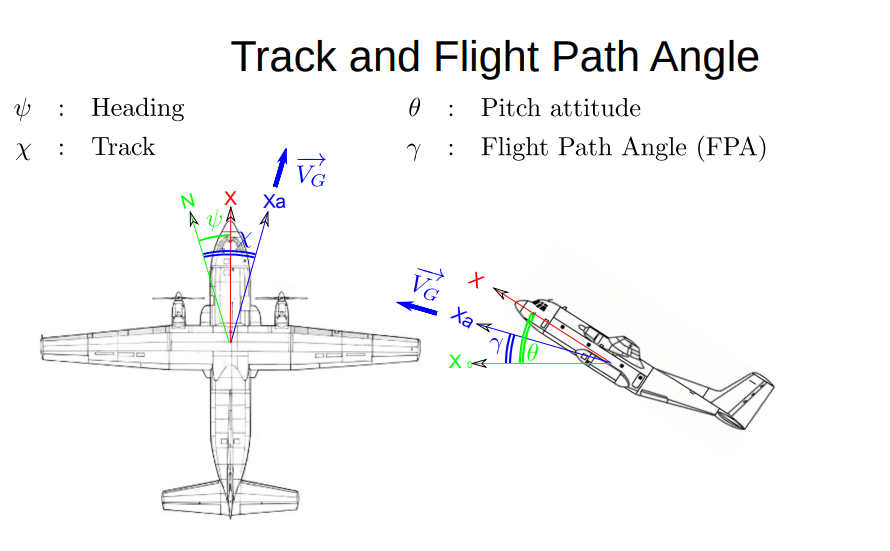 Flight Path Angle (ΓΓ): Angle between the speed vector and the horizontal plane, indicating climb or descent.