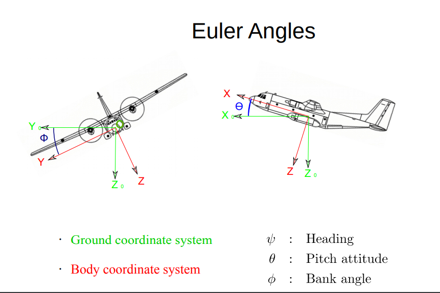 Attitude: Describes the airplane's orientation, i.e., where the nose and wings point. This is defined using Euler angles.