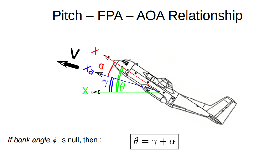 When the bank angle is zero, the relationship Θ=Γ+αΘ=Γ+α holds. However, this is invalid during turns where the angles are in different planes.