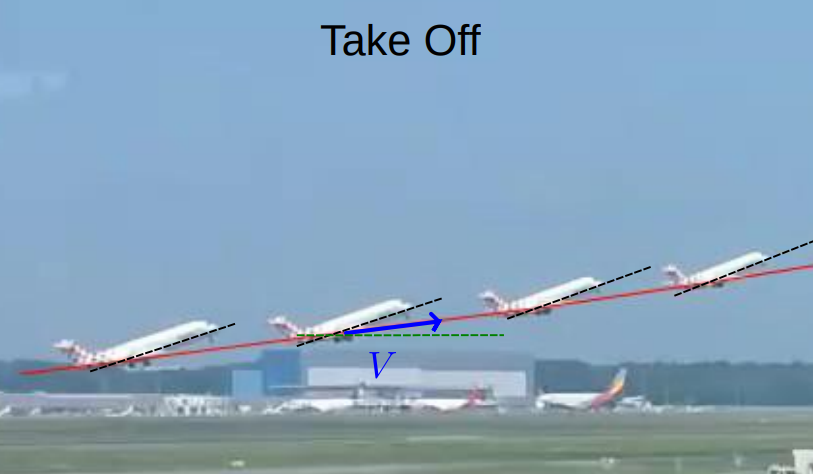 During takeoff, the flight path angle (ΓΓ) is the angle between the speed vector and the horizontal. The angle of attack (αα) is between the speed vector and the aircraft's longitudinal axis, while the pitch (ΘΘ) is between the horizontal plane and the longitudinal axis.