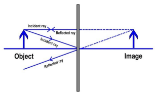 plane mirror makes an image of objects in front of the mirror; image appears to be behind the plane in which the mirror lies
