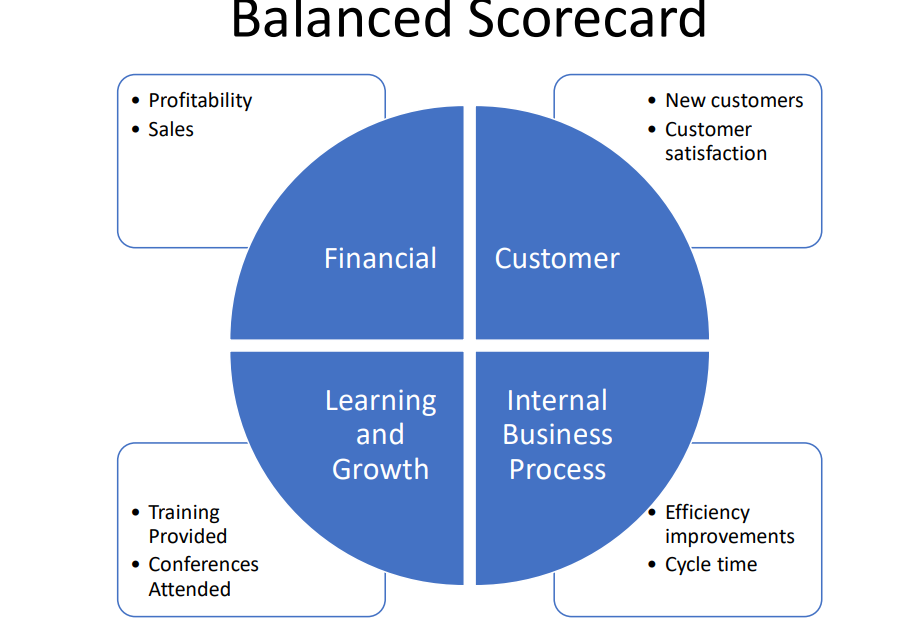 Metrics may cover: efficiency improvements, cycle time, training provided, conferences attended, new customers, customer satisfaction, profitability, sales.