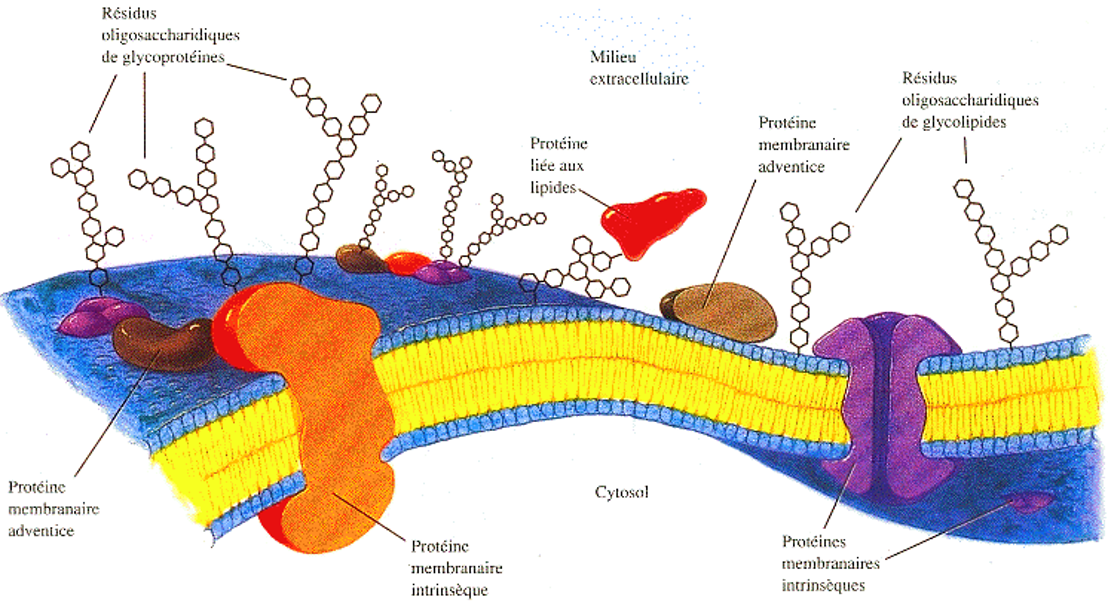 La membrane plasmique est constituée d'une bicouche lipidique, de protéines et de glucides associés de diverses manières à la bicouche.